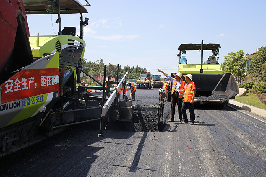 攤鋪機、壓路機等設備緊張有序運行,高達170℃的瀝青混合料炙烤著公路人