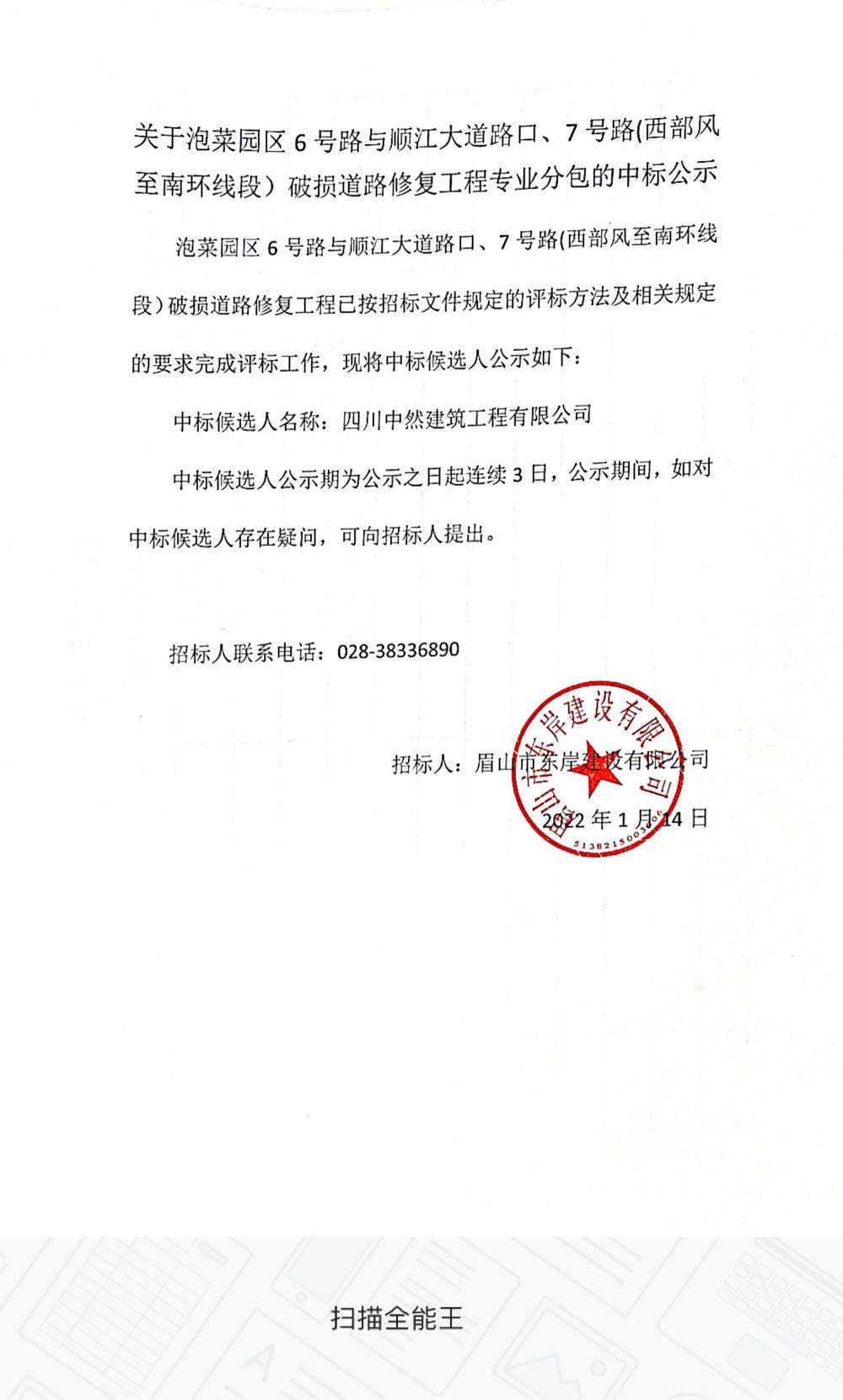 關(guān)于泡菜園區(qū)6號路與順江大道路口、7號路(西部風至南環(huán)線段)破損道路修復工程專業(yè)分包的中標公示